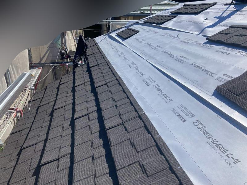 防水シートを取り付けていきます。その後、しっかりと固定し、雨水の侵入を防ぐための処理を施します。