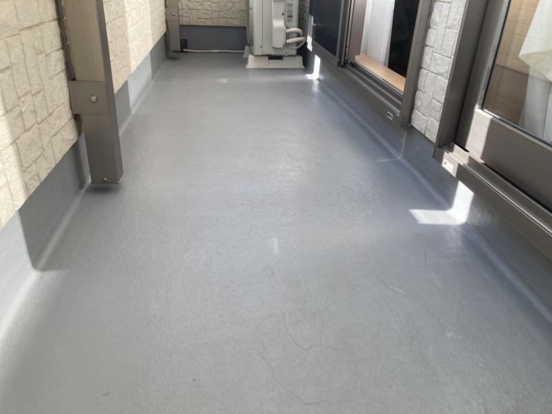 経年劣化によりベランダの塗膜がひび割れていました。メンテナンスのサインになります。紫外線により塗膜が硬くなりひび割れが起きてしまいます。