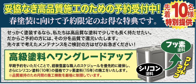 2月 外壁・屋根塗装 予約限定のお得な特典!高級塗料へワングレードアップ!