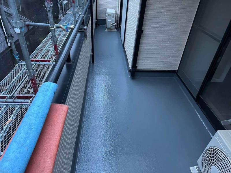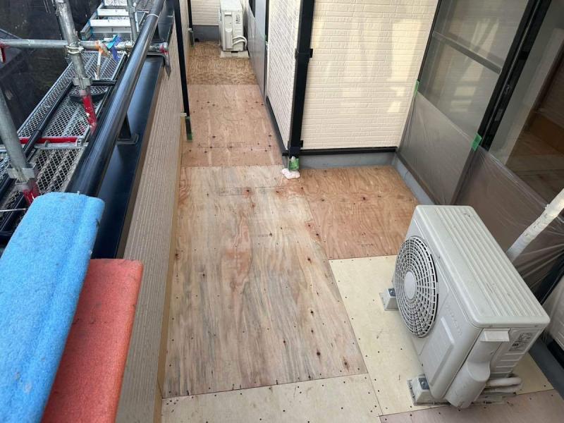 下地に水が浸透してしまっており、上に乗ると床がふかふかしてしまう状態でしたので下地を補強するためにコンパネを貼らせていただきました。